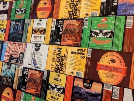 Wolf Brewing's label wall. Image Credit: Wolf Brewing Facebook