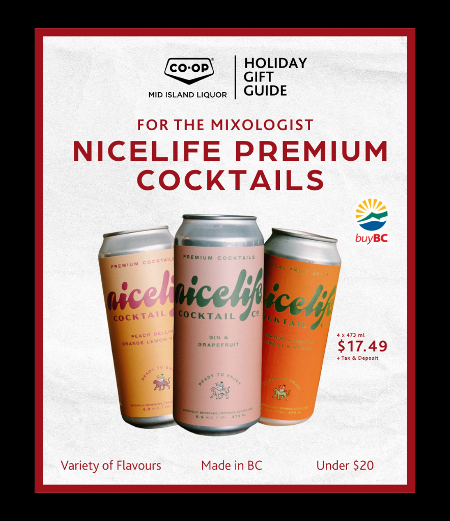 Founded in Port Coquitlam, Nicelife Cocktails serve up premium canned cocktails with the freshest ingredients and balanced flavours. Stick to classics like gin and juice, or opt for something unique like prickly pear for a festive treat. No more messing around with jiggers and shakers, just crack open a cold one.