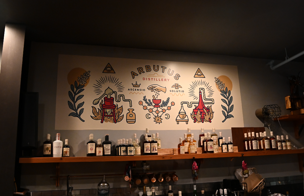 Artwork behind the Arbutus Distilling bar featuring the “Ascensio Solutio” tagline.